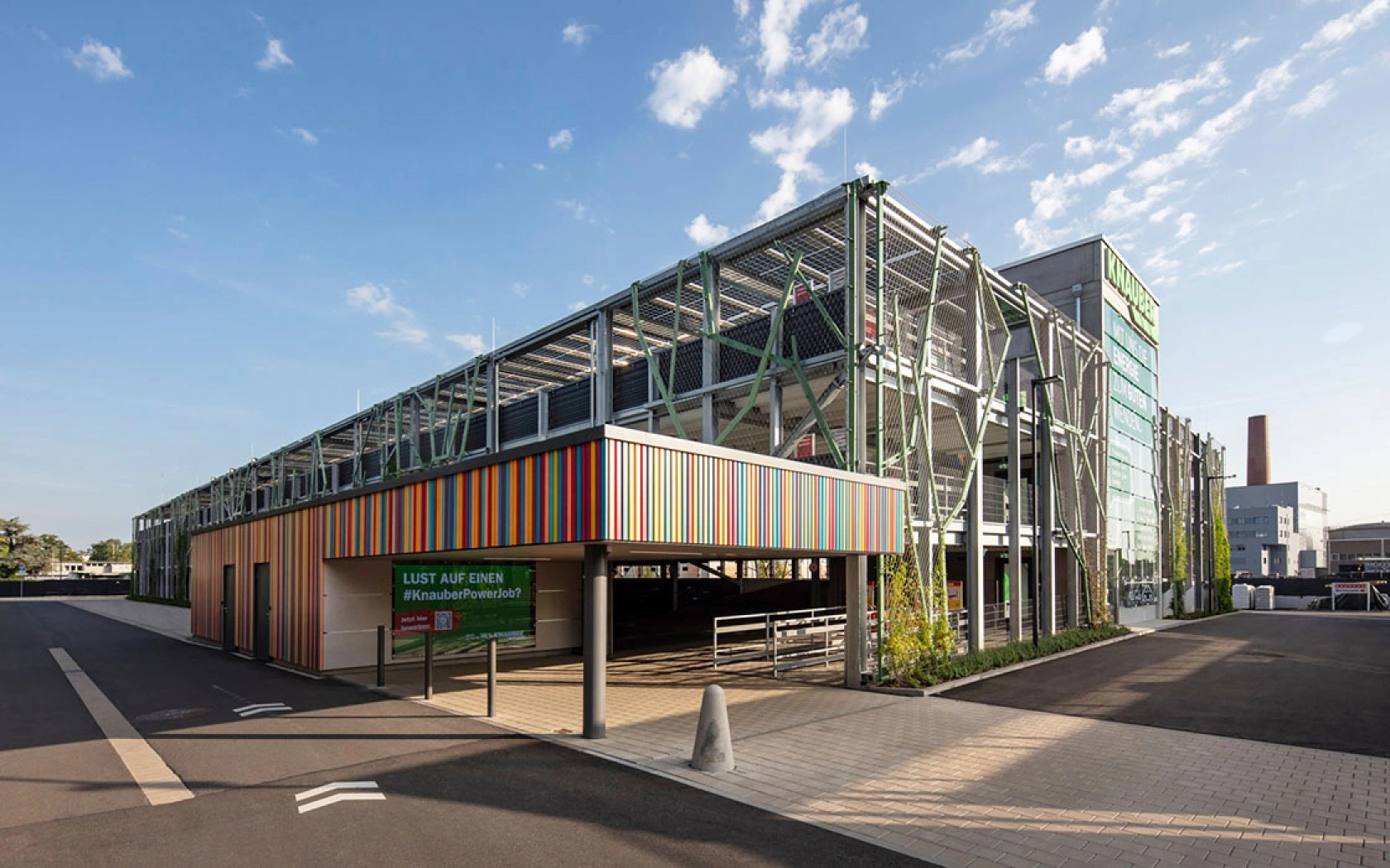 Der Anspruch, einen aktiven Beitrag zur Mobilitätswende beizutragen, spiegelt sich auch im neuen Parkhaus wider: Knauber unterstützt klimafreundlichere und zukunftsorientierte Mobilitätsalternativen und bietet daher Stellplätze mit AC-Ladepunkten an, die E-Autos, E-Bikes und -Lastenräder versorgen können. Perspektivisch werden bis zu 111 E-Ladeplätze entstehen, um einem größeren Bedarf in den nächsten Jahren nachkommen zu können. Auch optisch wird das neue Knauber Parkhaus die bisherige Parkfläche aufwerten: Die moderne und luftige Fassade wird umlaufend mit vielfältigen Blüten- und Rankpflanzen begrünt, die heimischen Insekten eine neue Nahrungsquelle bieten.
